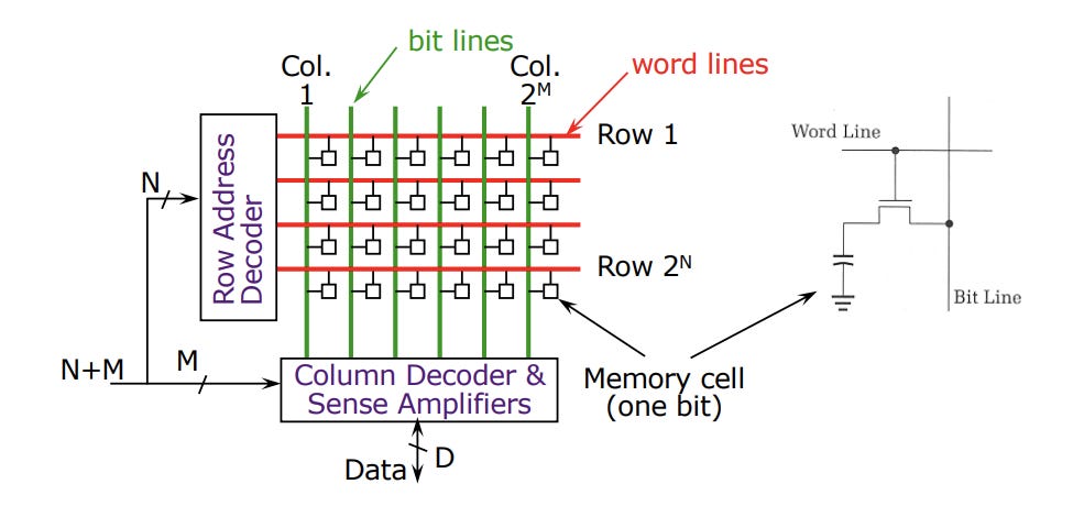 Rowhammer is an attack on DRAM that manipulates the underlying physics of the memory cells to flip bits in rows of memory that an attacker shouldn’t have access to. In DRAM, each memory cell is implemented using one capacitor and one transistor, in a design called 1T1C memory. All of these capacitors are packed together so densely in modern DRAM that there’s a meaningful electrical coupling between capacitors in different rows of the memory.