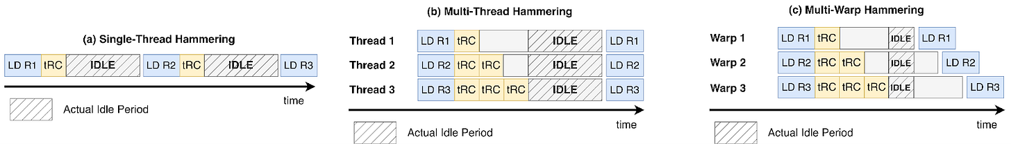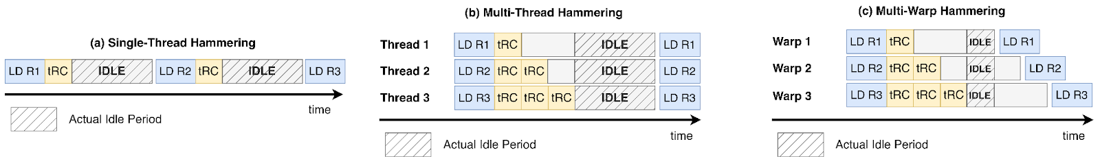 Another big challenge is that GPU memory accesses are slower than CPUs, which makes hammering much harder. If you try to have a single threaded process repeatedly access the same memory, there won’t be enough memory accesses fast enough to cause a rowhammer effect. However, by leveraging warp-level parallelism, multiple warps can be issuing memory reads simultaneously, and cause enough hammering to actually flip bits in the victim rows.